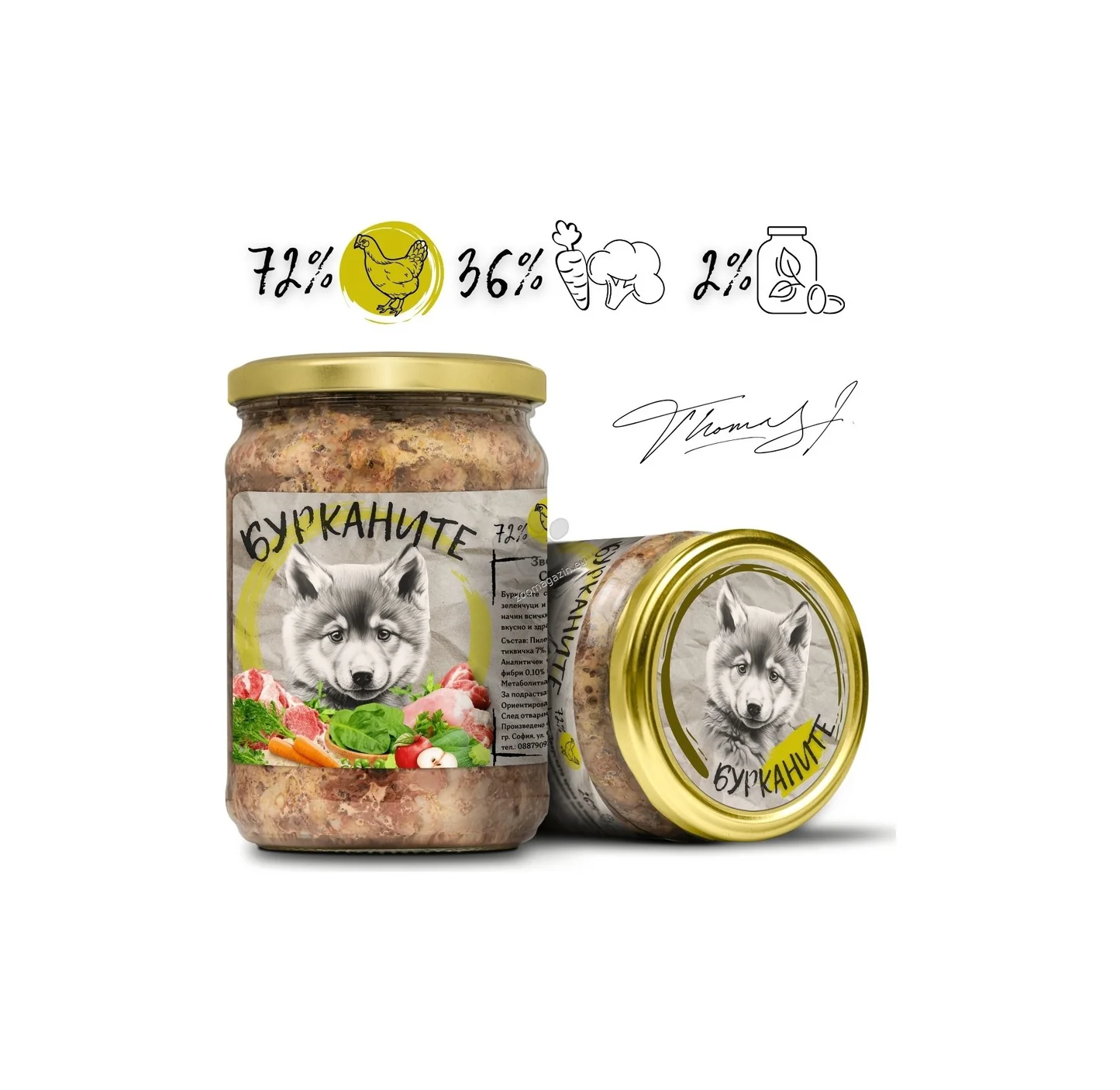 Бурканите са ежедневна храна за домашни зверове. Приготвени са от месо, зеленчуци и хранителни добавки. Готви се в буркан чрез стерилизация. По този начин всички полезни вещества остават в буркана, което прави менюто питателно, вкусно и здравословно. Натурална храна без консерванти, овкусители и оцветители.