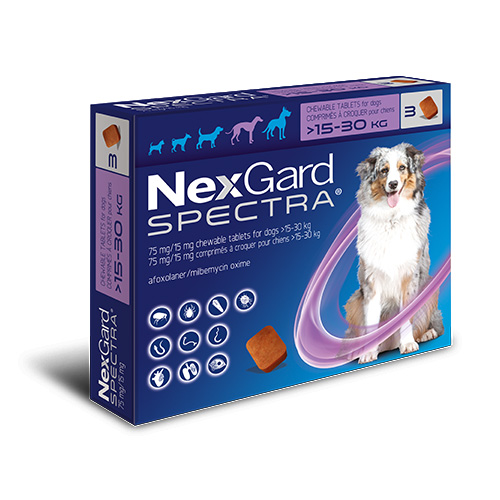 NexGard Spectra – вкусни таблетки за кучета от 15 до 30 кг – за профилактика срещу външни и вътрешни паразити
