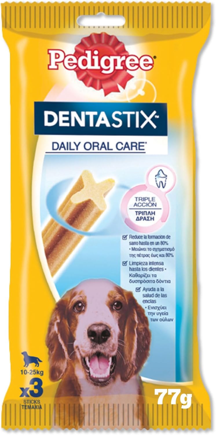 Зъбите са много важни за кучетата и изискват специална всекидневна грижа. Лакомството Pedigree Dentastix Daily Oral Care е удобен и приятен начин да поддържате здрави зъбите и венците на Вашия любимец. Научно доказано е, че при всекидневна употреба, благодарение на комбинацията от специалната текстура и активните почистващи вещества на продукта, Pedigree Dentastix Daily Oral Care успява да намали образуването на зъбен камък с до 80%. Pedigree Dentastix Daily Oral Care са лесни за храносмилане и не се ронят. Освен това пръчиците за дъвчене са толкова вкусни, че Вашият любимец би пренебрегнал всичко, само за да им се наслади.